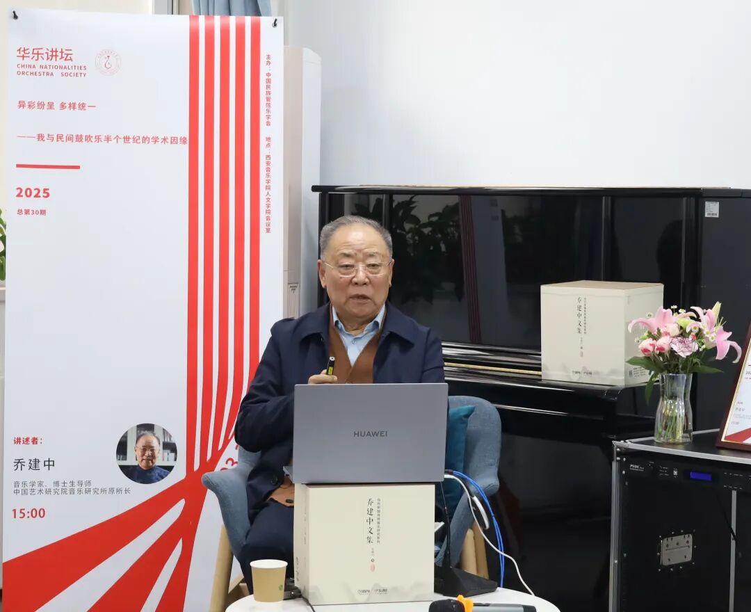 2025年3月29日下午,“华乐讲坛”第三十期在西安音乐学院人文学院举行。著名音乐学家、中国艺术研究院音乐研究所原所长、博士生导师、中国民族管弦乐学会专家委员会副主任乔建中先生开讲《异彩纷呈 多样统一——我与民间鼓吹乐半个世纪的学术因缘》。中国民族管弦乐学会会长吴玉霞、中国音乐学院副院长黄虎、陕西省民族管弦乐学会副会长樊艺凤、西安音乐学院人文学院青年教师徐龙、中国民族管弦乐学会副秘书长宋阳、《中国民乐》报执行总编辑刁艳、考级工作小组副组长张殿新和来自全国多地的艺术院校、表演团体代表在现场聆听。