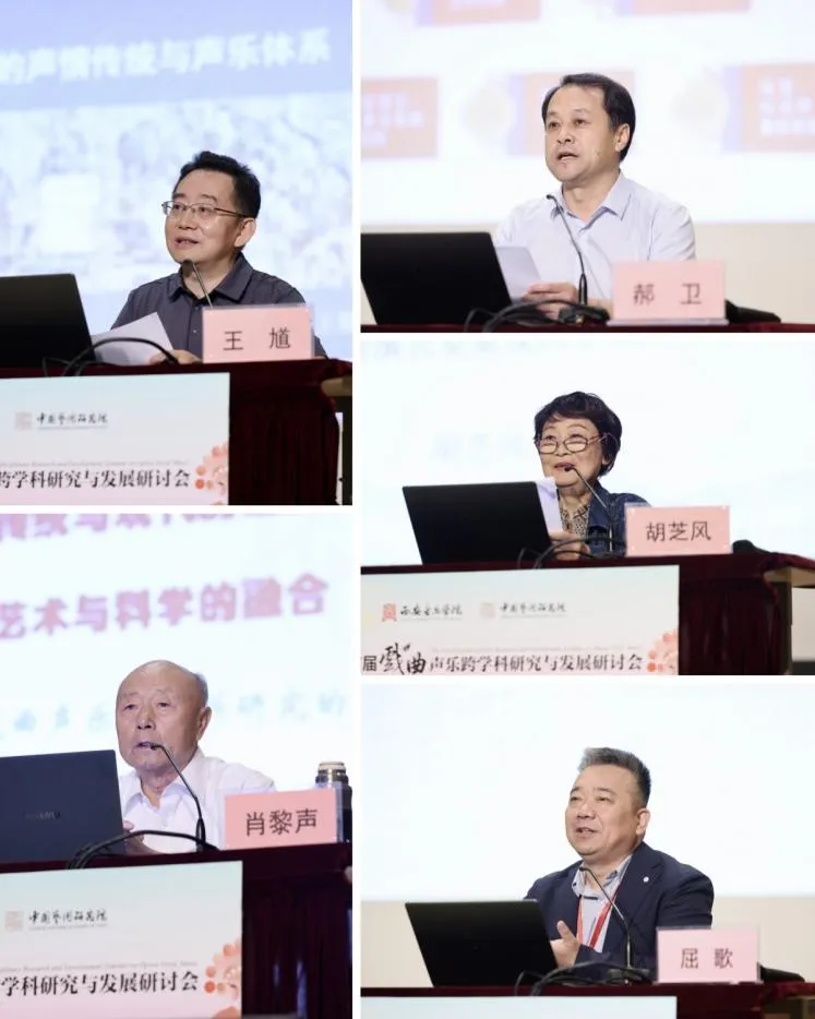 14日上午为会议的主旨报告环节。王馗以《中国戏曲的声情传统与技术规范》为题,系统阐释了中国戏曲“以声传情、以情带声”的美学传统,深入剖析了声腔技术规范在不同剧种中的演变逻辑与文化内涵,为跨学科研究提供了历史维度的理论锚点。内蒙古师范大学音乐学院肖黎声教授以《传统与现代的碰撞,艺术与科学的融合——戏曲声乐跨学科发展的期盼》为题,探讨了在当代语境下,如何实现传统戏曲唱法与现代表演理念、声乐科学技术的有效对话与融合创新。戏曲研究所资深研究员胡芝风以《戏曲演员要重视科学发声》为题,从戏曲实践角度,强调了科学发声理念和系统训练对提升戏曲演员演唱能力与艺术生命的重要性。陕西省戏曲研究院副院长郝卫以《秦腔演唱的几点思考》为题,结合秦腔艺术特色,分享了关于演唱技法、风格把握及传承发展的独到见解。本次研讨会发起人与组织者、艺术嗓音科技陕西省高等学校重点实验室主任屈歌以《当代戏曲声乐的历史经验与发展路径》为题,梳理了建国以来70余年我国戏曲声乐的发展历程,并对其未来可能的研究方向和创新路径进行了探讨。本环节由西安音乐学院高贺杰教授主持。